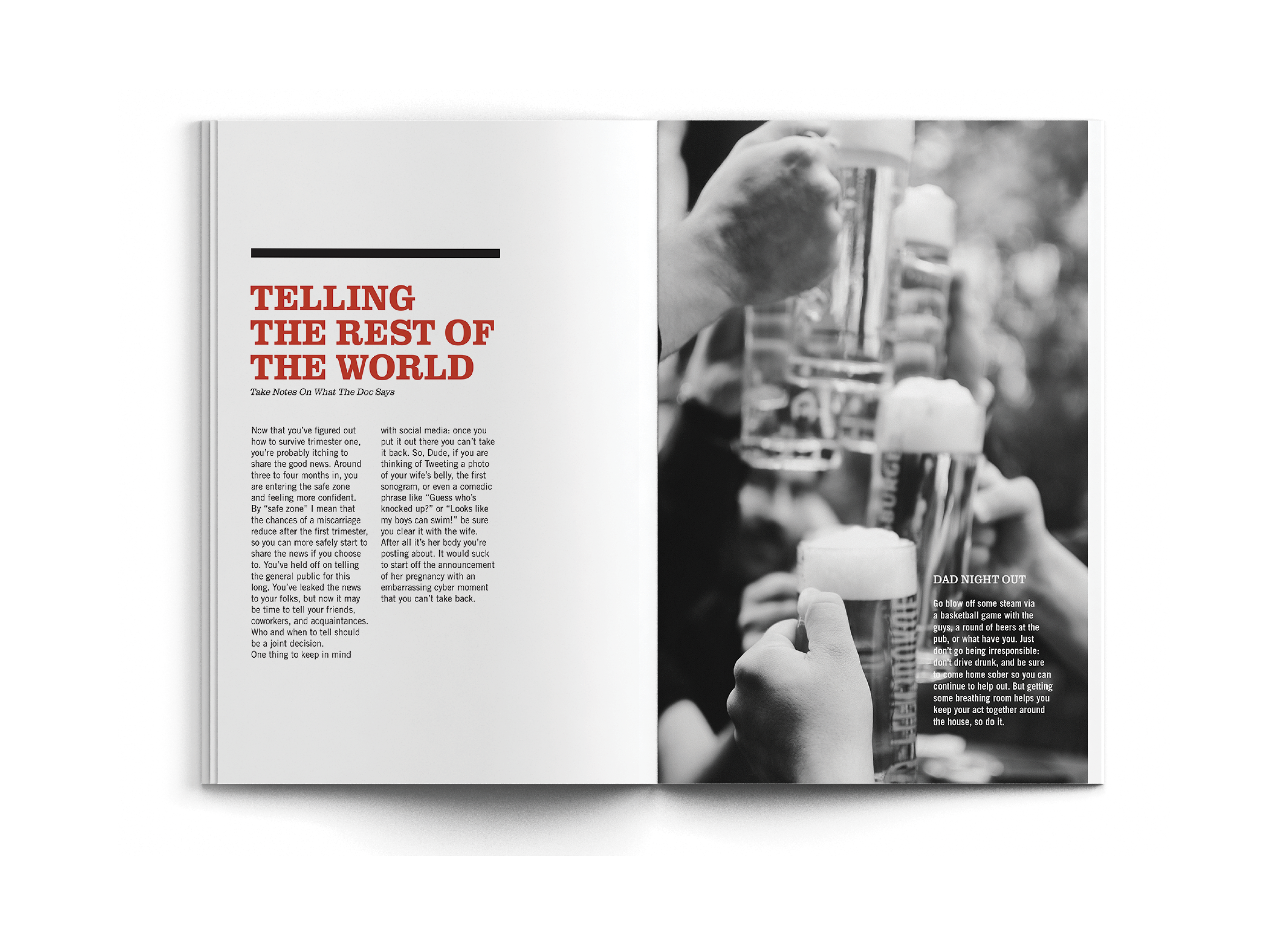 From Dude to Dad is a how-to manual that gives the need-to know essentials to first time dads which will ultimately change his life. By using a Bold Typeface, a 2 color palette, and black and white imagery, it sets a gentle and firm tone without alarming men about the trimesters of a pregnancy.